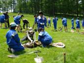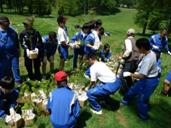 元後フル上の堅い地面をスコップで掘り、1つの穴にカミネッコンに入った苗木を3本寄せ植えします。木の種を手に取ってみたり、小さな実生を見つけたりして、「木の命の営み」も学びます。級友達とのよい思い出にもなります。